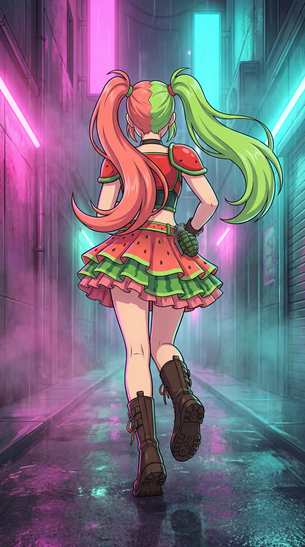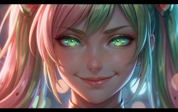 Green eyes, pink-green pigtails, watermelon clips — FACE LOCK