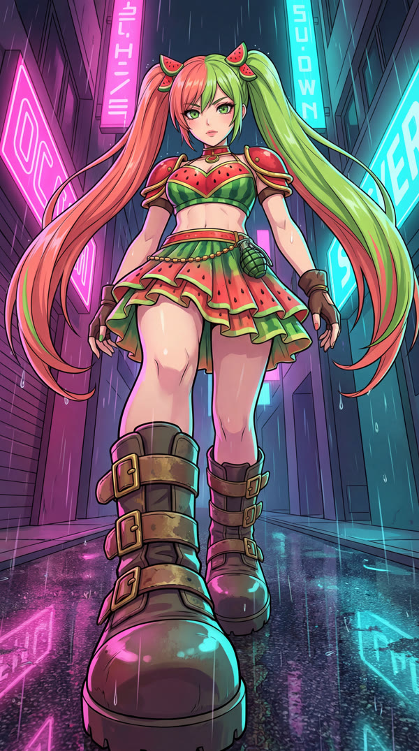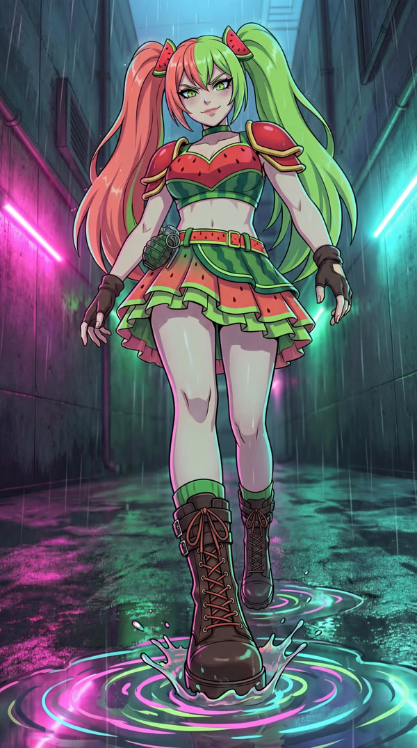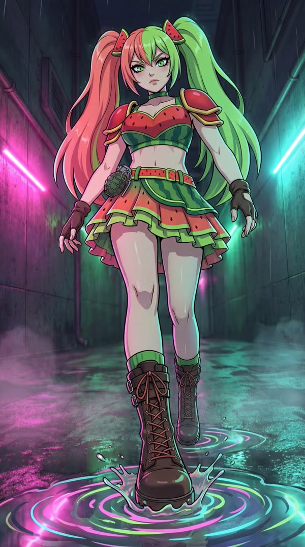 Smirk expression, full watermelon outfit
