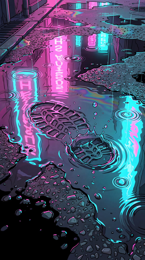 Boot tread in puddle, rain, neon — texture ref