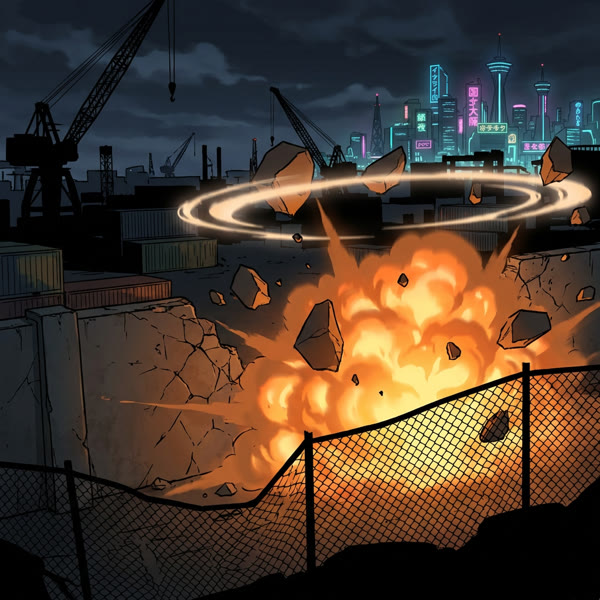 No background music. No BGM. No soundtrack. Pin metallic click, grenade arc whistle, concrete explosion blast, debris scattering on asphalt, dust whoosh past camera, boot crunch on rubble, fabric snap from blast wind.
