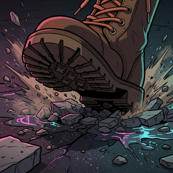 Shot 04 (0:07-0:08): Camera DIVES THROUGH the dust cloud. She strides forward — split pigtails whip behind her from blast wave, terracotta boot laces catch orange firelight, left boot CRUNCHES on rubble sending pebbles skittering, right boot follows through shallow puddle sending amber-lit spray. She no longer has a grenade — it is now the explosion. Belt is empty.